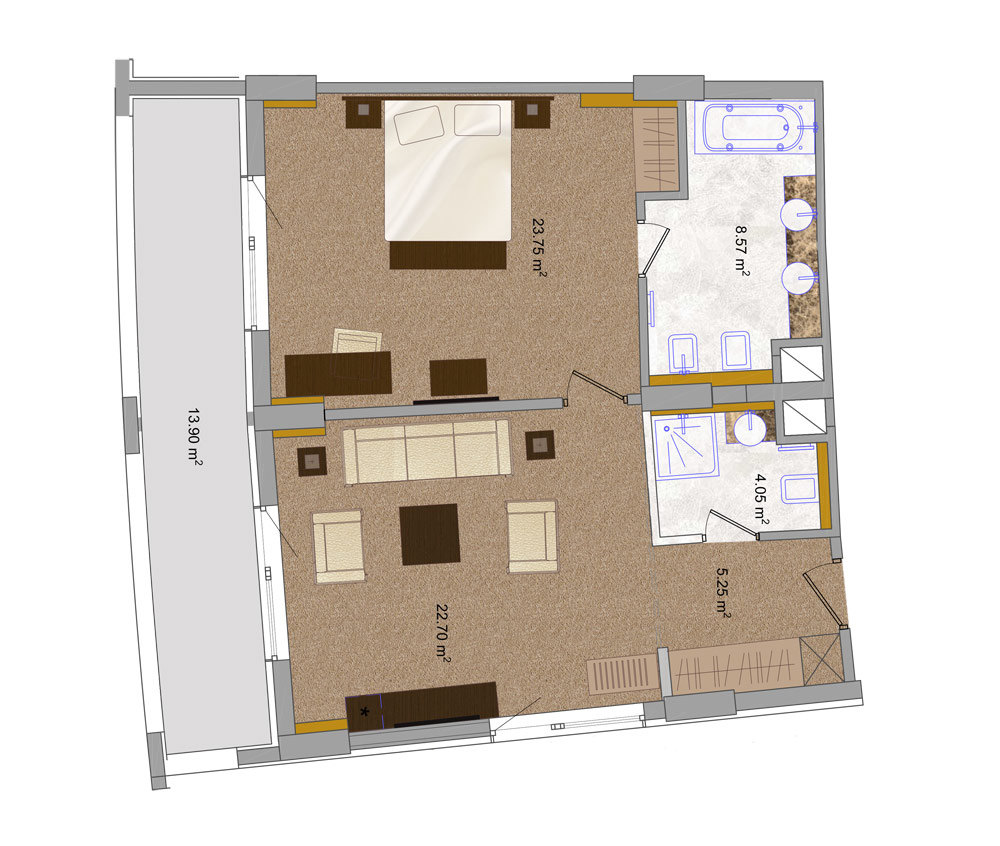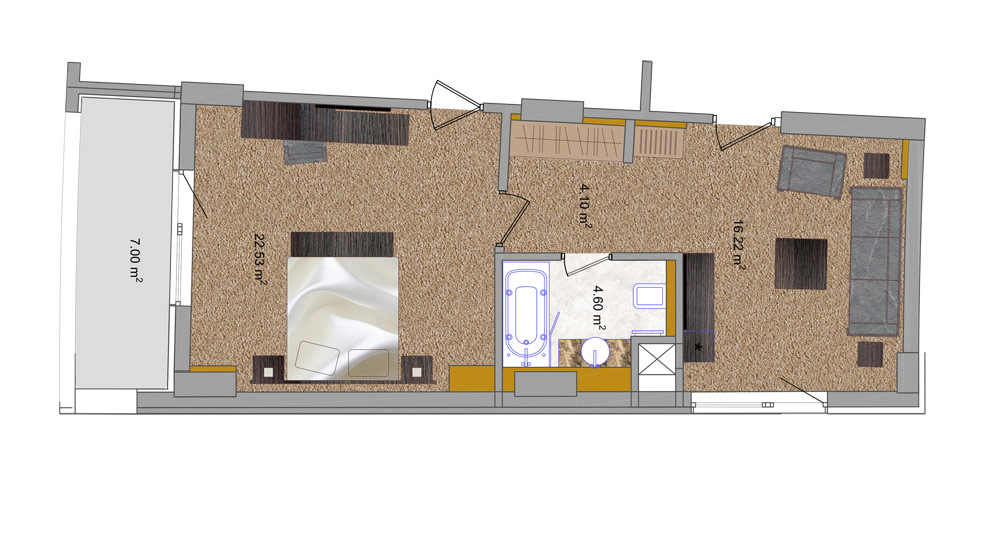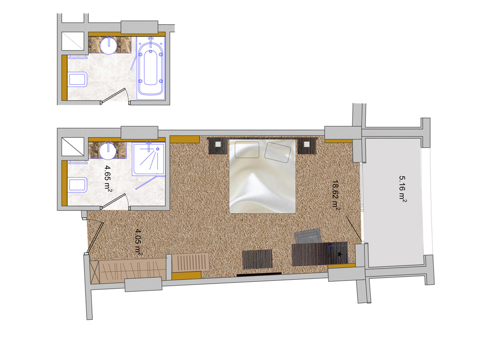 Інтер'єри номера оформлені в мінімалістичному і одночасно вишуканому стилі. Чудовим доповненням до кожного номеру категорії «Стандарт» є великий балкон або лоджія.