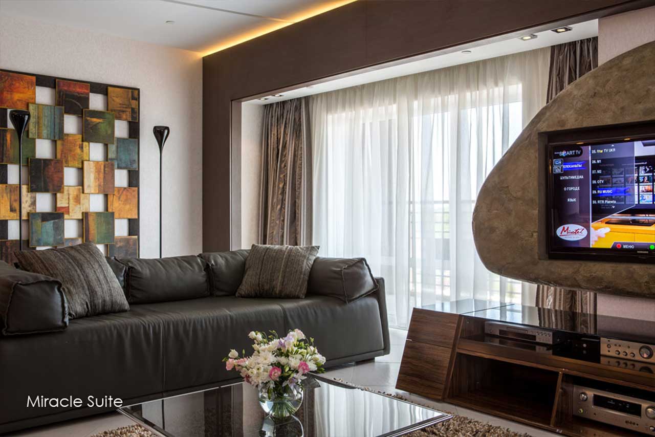 А в Міротелі номери всіх категорій обладнані зручними меблями, телевізорами (супутникове ТБ), міні-барами, сейфами, телефонами з внутрішнім, міським та міжнародним зв'язком, санвузлами (з цілодобовим забезпеченням холодною та гарячою водою), в кожному номері є балкон. Прибирання номерів проводиться щодня, зміна рушників - щодня і за бажанням гостя, зміна білизни - 3 рази в тиждень. У зоні лобі комплексу, до послуг гостей, безкоштовний доступ до мережі Wi-fi.