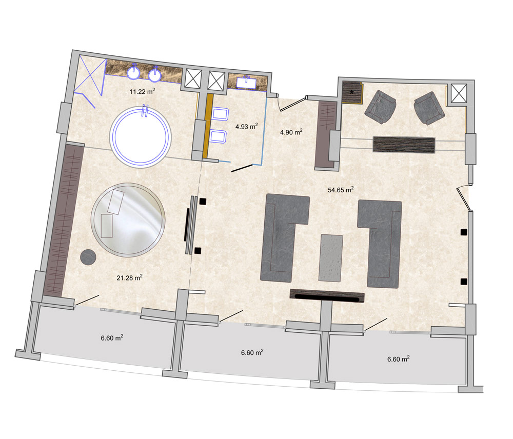 У номері до вітальні примикають дві окремі спальні, у кожній є власна ванна кімната і величезний балкон.